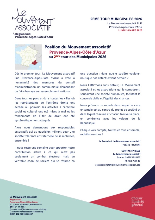 Dans le contexte du second tour des élections municipales, et au regard des enjeux qui traversent aujourd’hui notre société, la CRESS PACA relaie le communiqué du Mouvement associatif Provence-Alpes-Côte d'Azur.