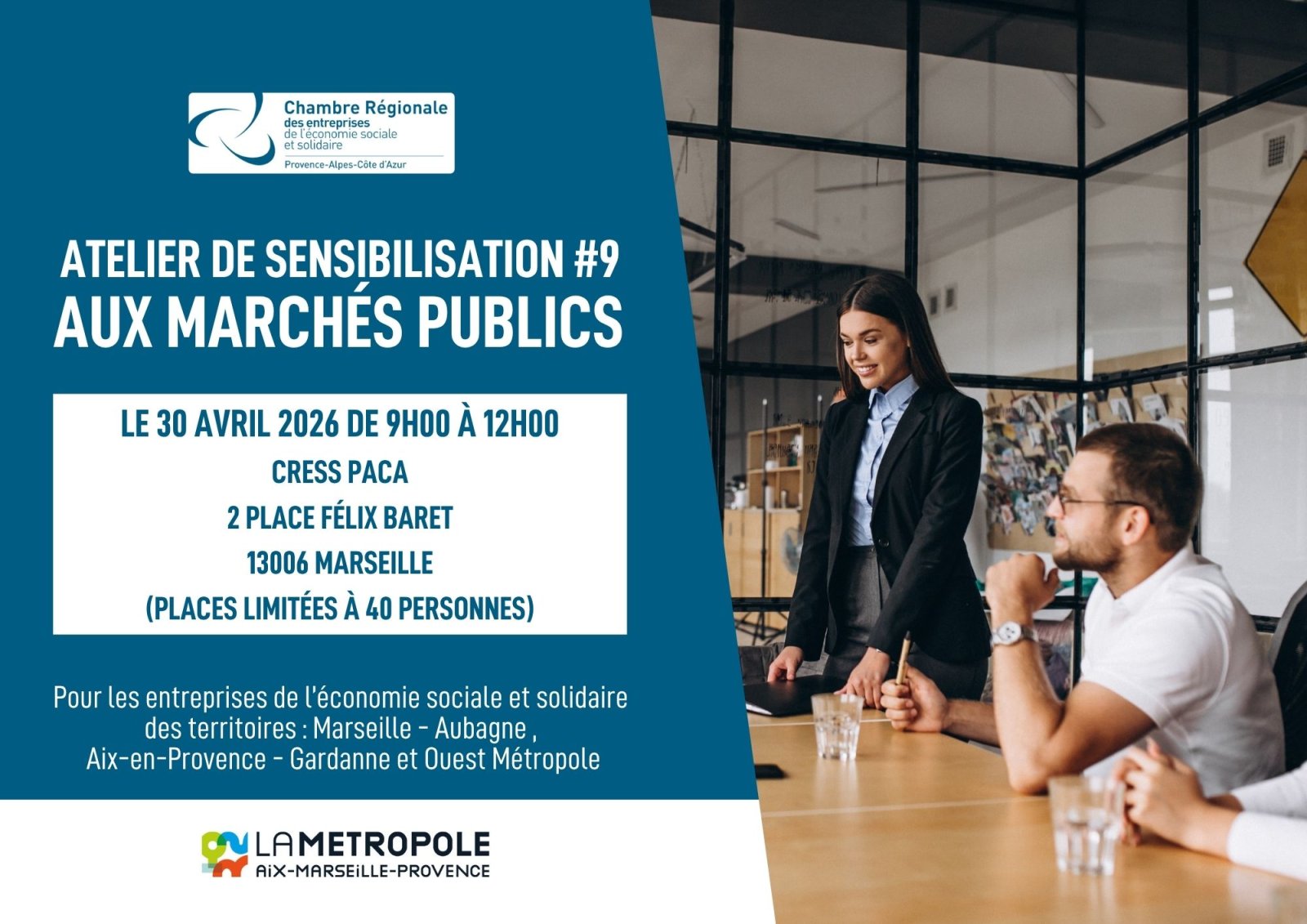 Dans le prolongement des rencontres acheteurs/fournisseurs ESS'presso, les entrepreneurs de l'ESS sont invités à un atelier de sensibilisation aux marchés publics, avec les juristes de la Métropole Aix-Marseille-Provence, le 30 avril 2026 de 9h00 à 12h00, à la CRESS PACA, 2 place Félix Baret, 13006 Marseille.