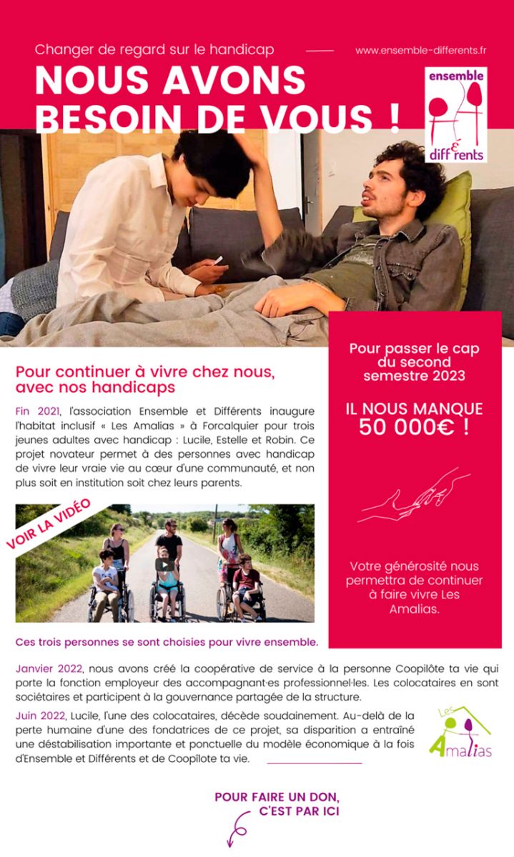 Permettre de continuer à faire vivre l’habitat inclusif « Les Amalias ». Tel est l’objectif de l’appel aux dons lancé par l’association Ensemble et Différents et la coopérative Coopîlote Ta vie, soutenu par la CRESS Provence-Alpes-Côte d’Azur. Au-delà de la perte humaine d'une des colocataires, sa disparition a entraîné une déstabilisation importante et ponctuelle du modèle économique du projet.