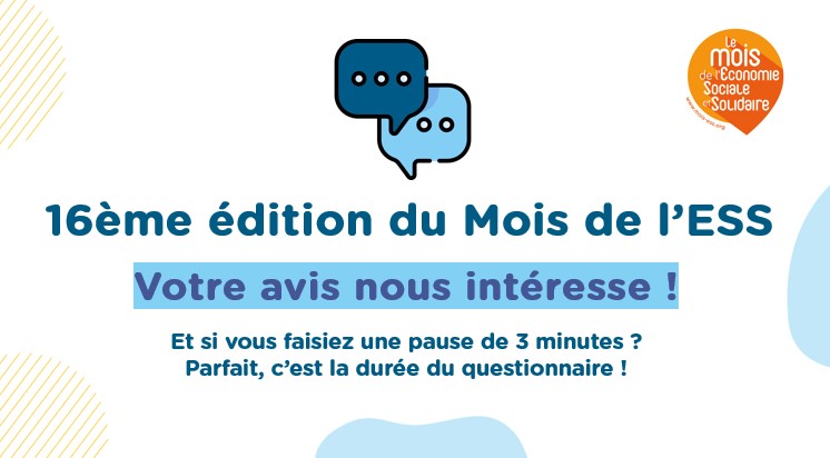 Vous avez suivi de près ou de loin le Mois de l’ESS 2023 ? Vous avez participé à un ou plusieurs événements ? Vous avez des retours à nous faire pour améliorer les prochaines éditions ? Vous avez des idées pour promouvoir ou sensibiliser à l’ESS ? Merci de vos retours précieux via ce formulaire (remplissage en moins de 3 minutes).